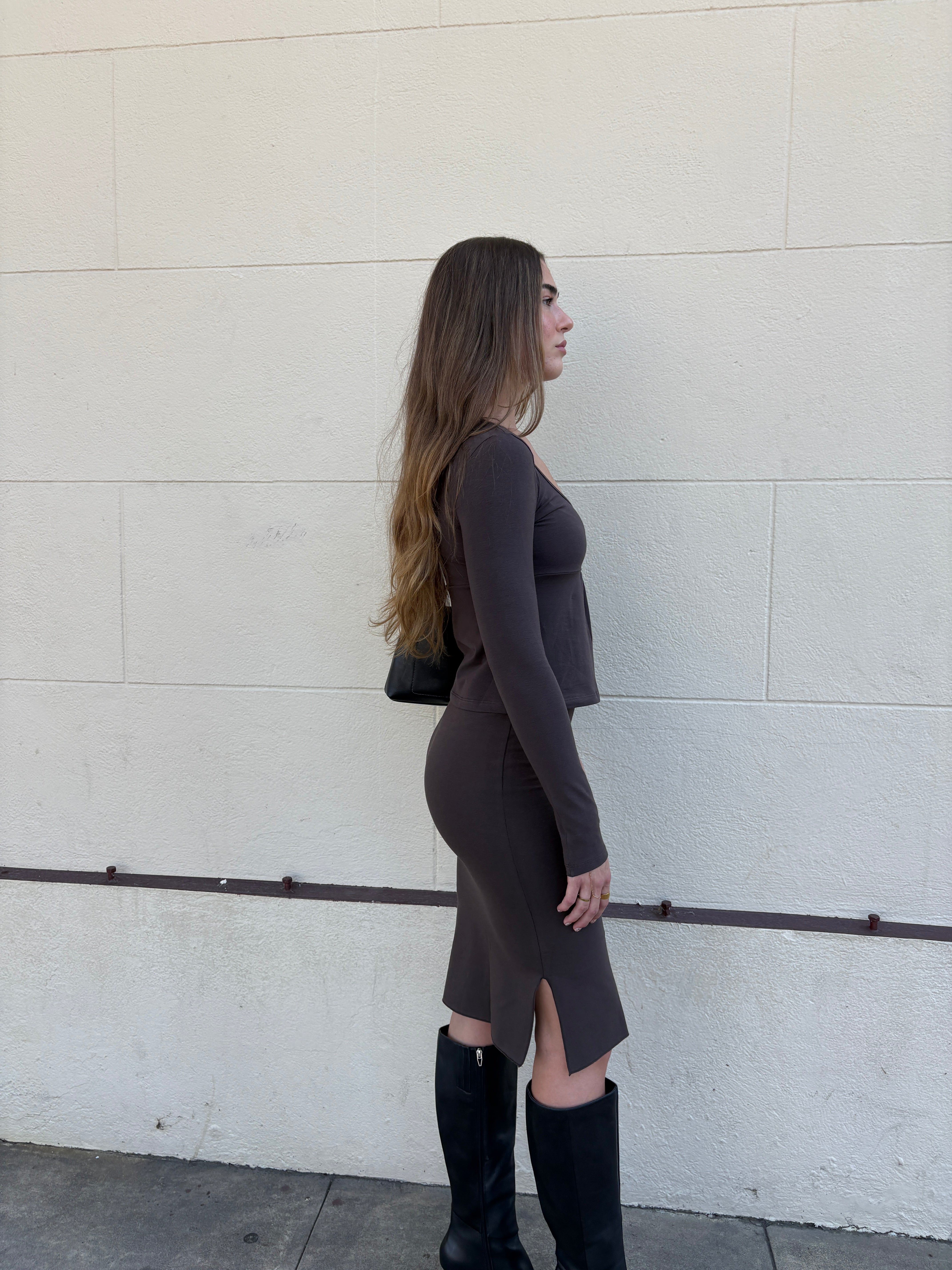 Low/mid-rise dark brown midi skirt with two slits on each side and a brown mini ribbon bow.